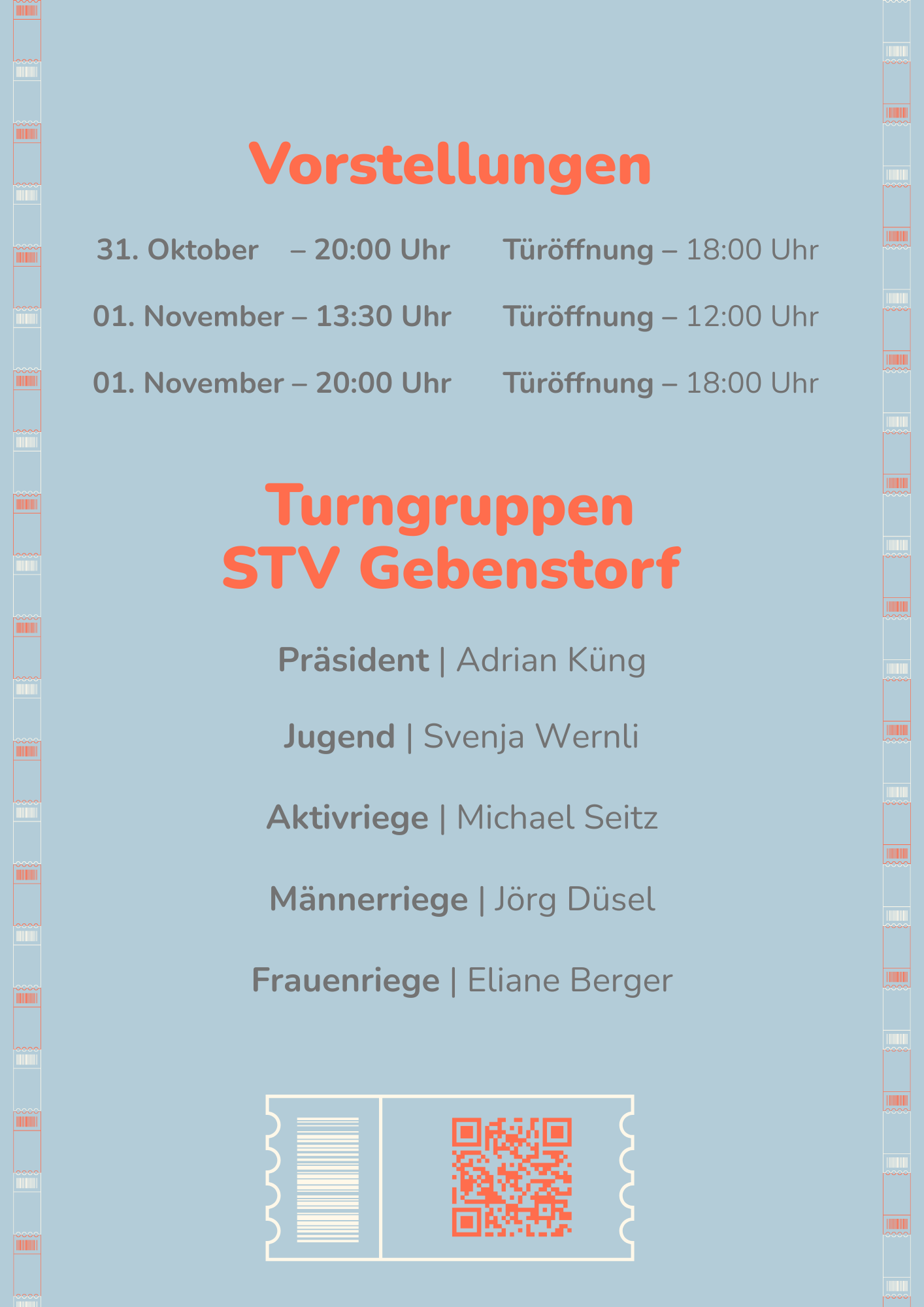 Erhalten Sie an diesem Abend einen Einblick in die Welt des Turnvereins... oder doch in die Popkultur der 80er? Vielleicht aber auch einfach ein gutes Stück schweizer Kultur. Lassen Sie sich überraschen. Was Sie sicher erwarten dürfen, ist Unterhaltung! Unter anderem auch dank dem Slampoeten und Geschichtenschreiber Simon Libsig, welcher als Extra-Gast auch einige Auftritte haben wird.