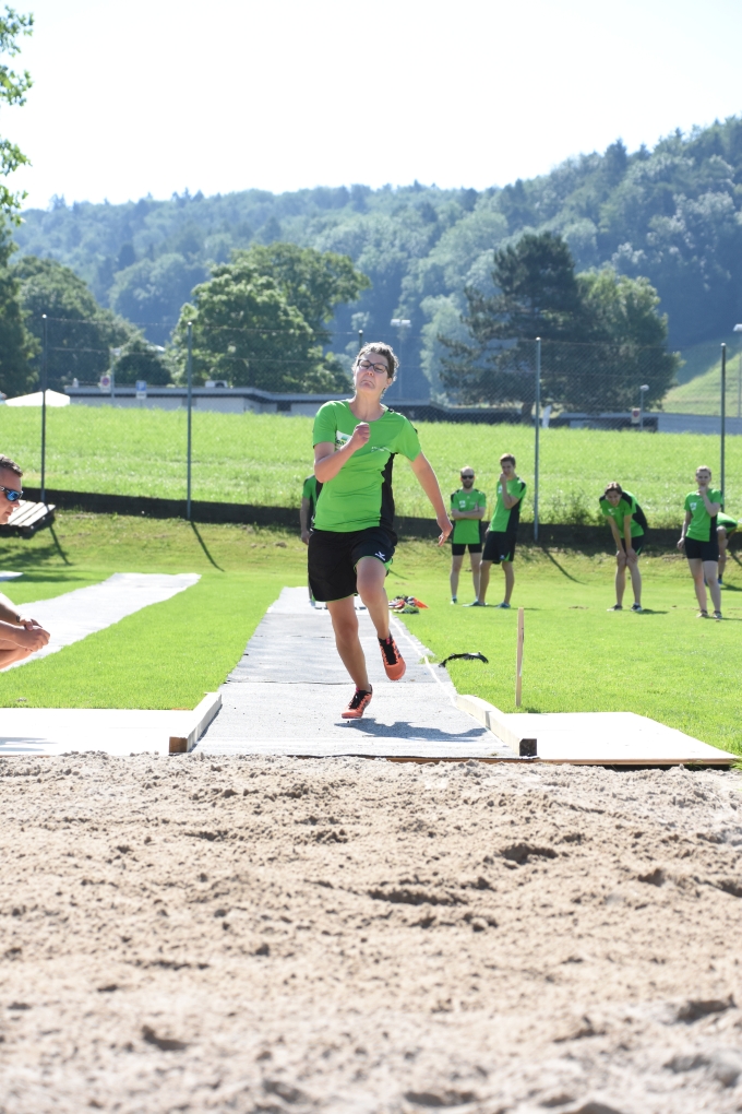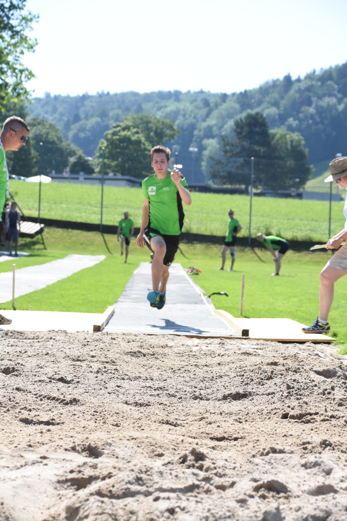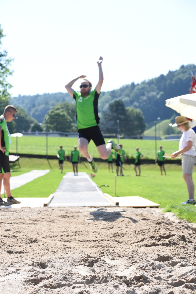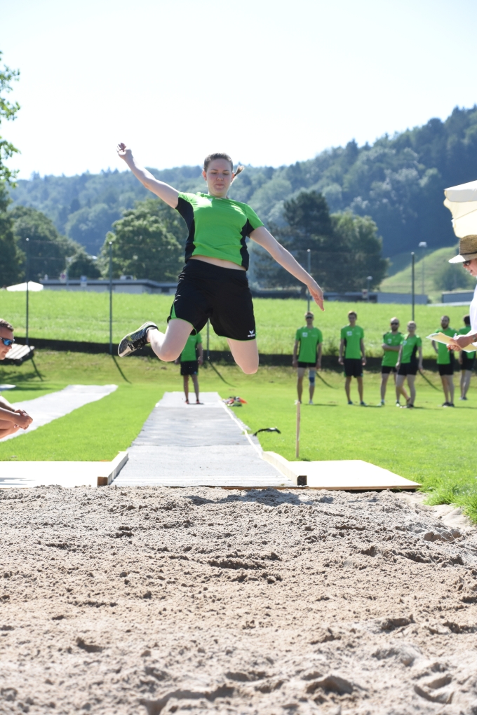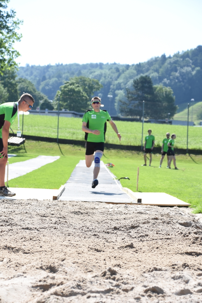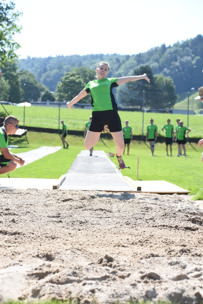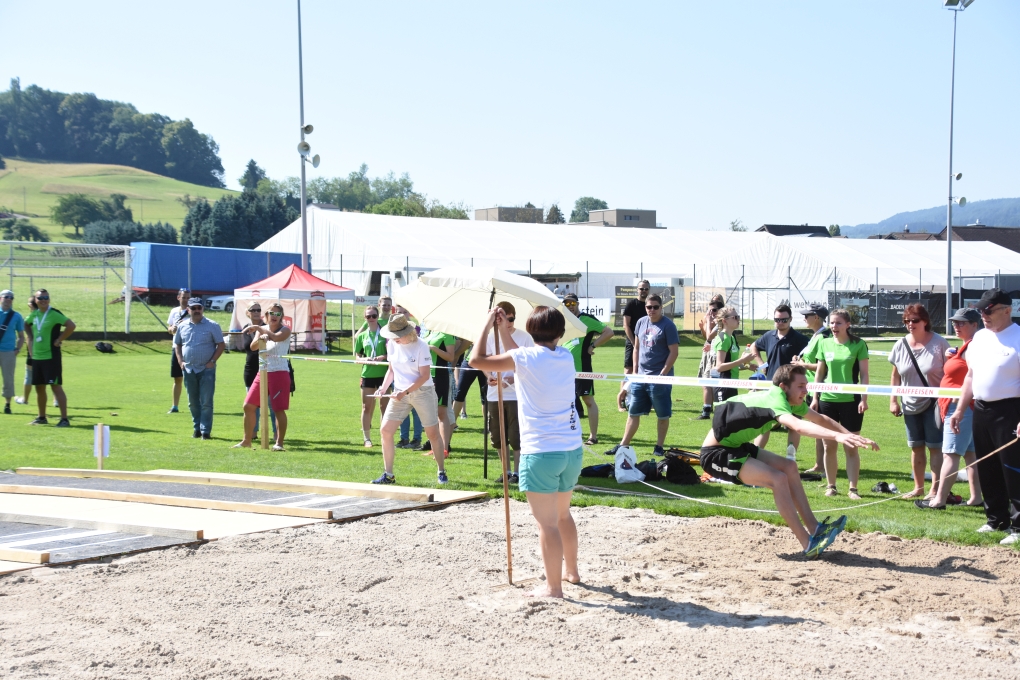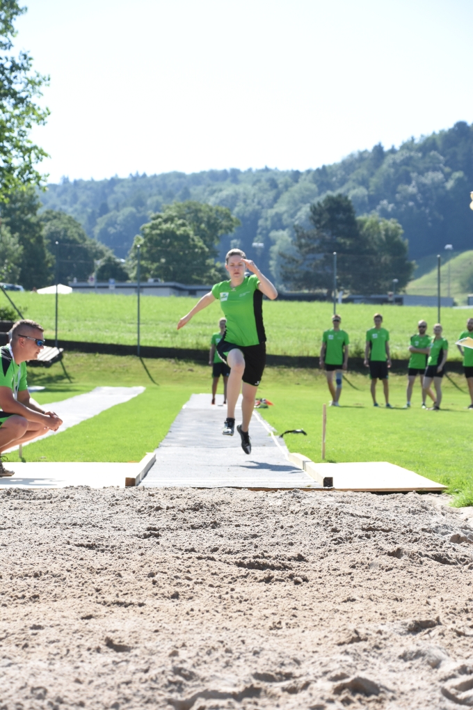 Weitsprung und Schleuderball: Hier zeigte die Organisation des ETF ein grosses Manko. Man musste sich nämlich mit den normalen ÖV zu den Wettkampfplätzen, welche in diesem Fall weit auseinander lagen, begeben. Dementsprechend kamen das Einlaufen und Vorbereiten zu kurz. Immerhin schien dies Svenja nicht zu beeindrucken, mit 4.31m erreichte sie die Note 9.00. Im Schleuderball war es dann so, dass die Anlaufbahn zu schmal war und unsere Aktivriegler:innen wortwörtlich aus der Bahn geworfen wurden.