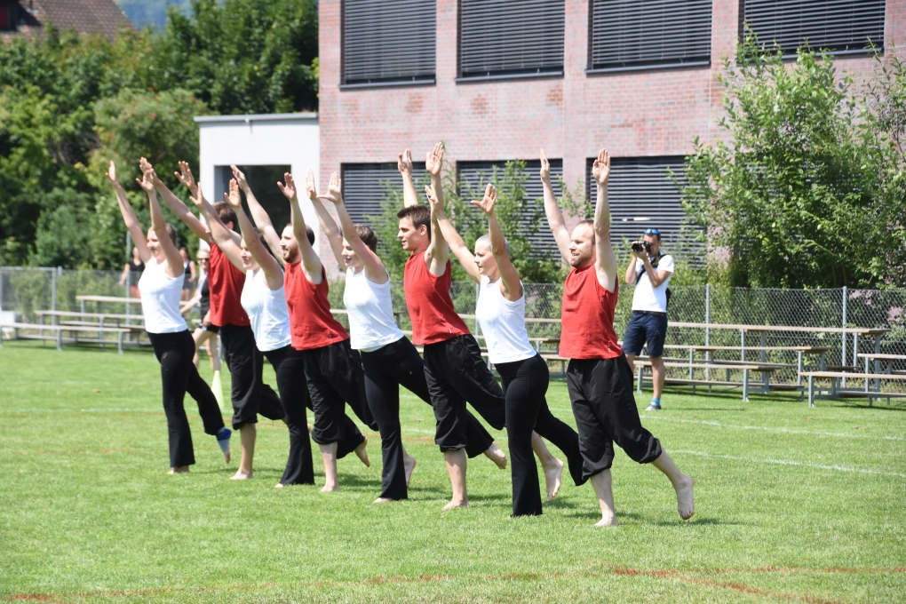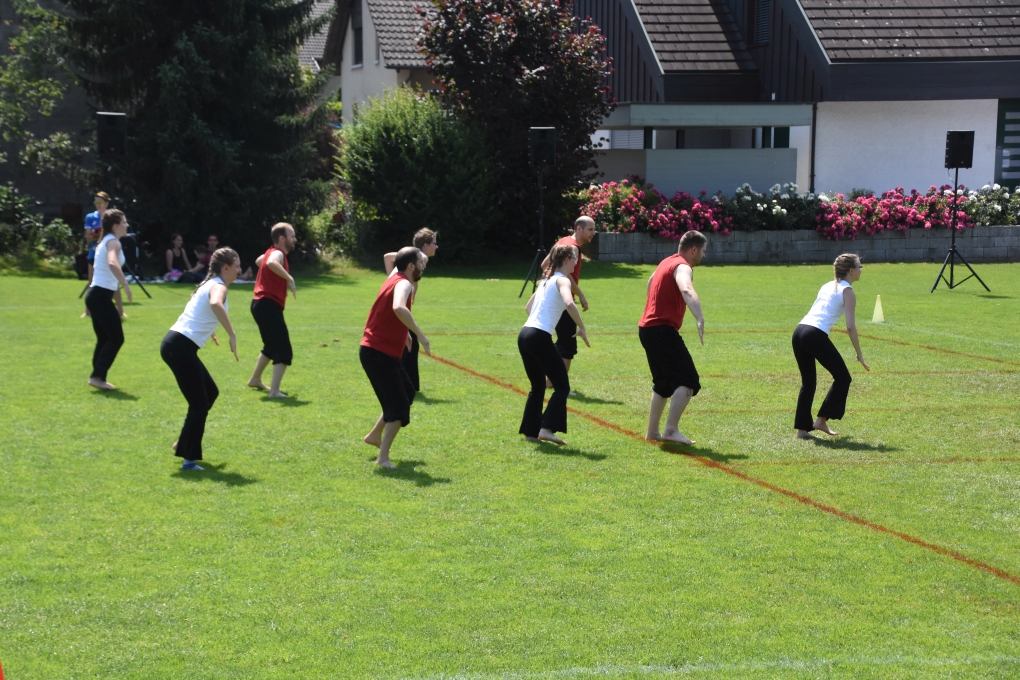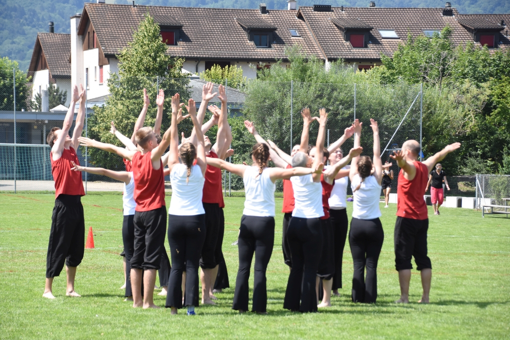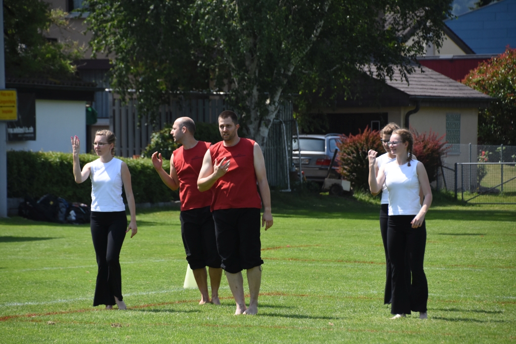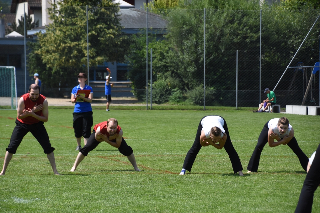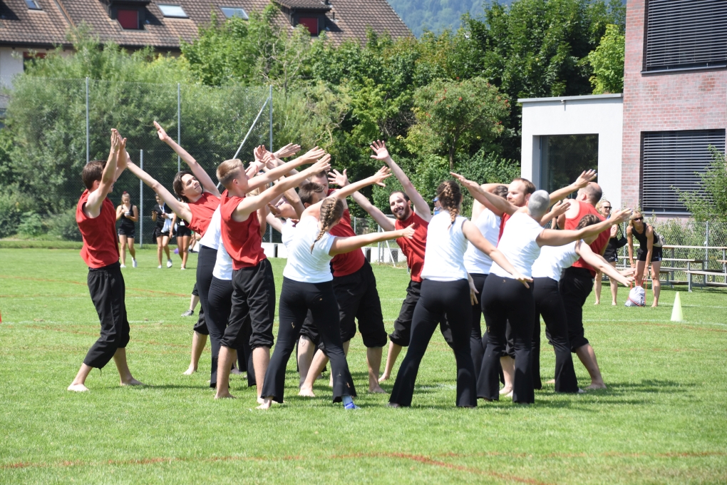 Gymnastik: Von den 10 Turner:innen welche aufliefen, waren 7 das erste Mal an einem Turnfest dabei und machten dementsprechend auch zum ersten Mal Gymnastik. Gerade noch vor dem Regen konnten wir unsere Nummer aufführen und wurden mit der Note 7.20 belohnt.