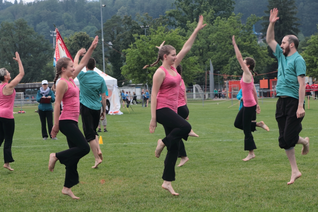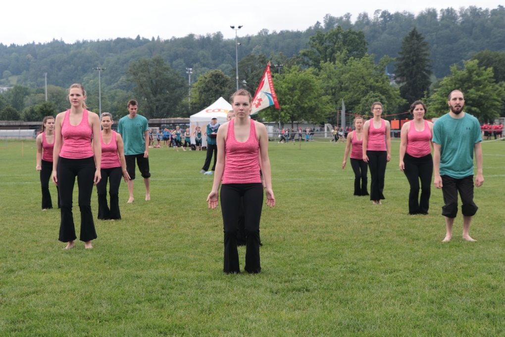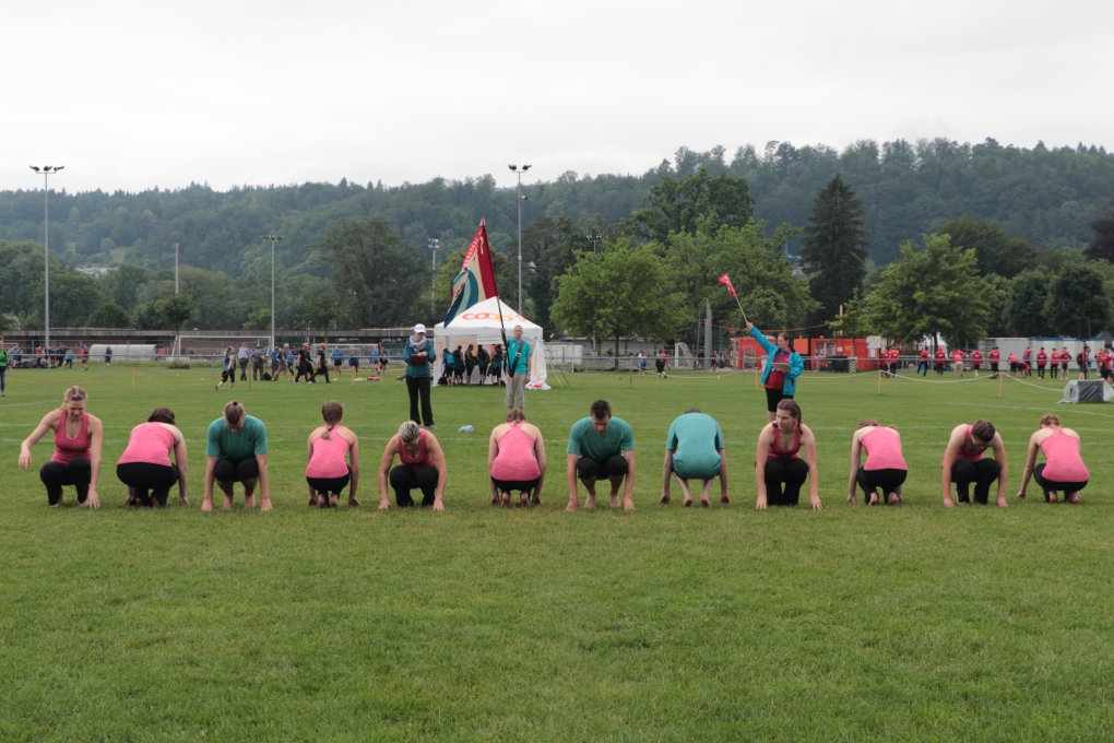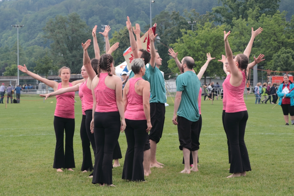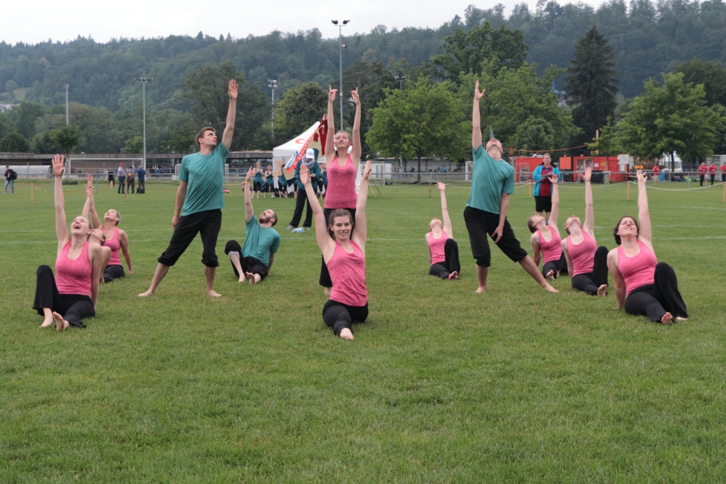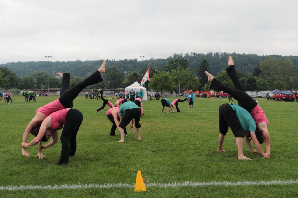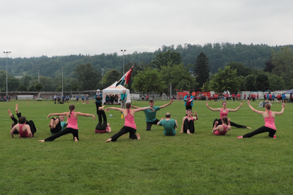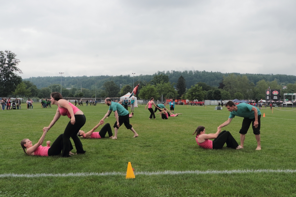 Gymnastik: Von den 10 Turner:innen welche aufliefen, waren 7 das erste Mal an einem Turnfest dabei und machten dementsprechend auch zum ersten Mal Gymnastik. Gerade noch vor dem Regen konnten wir unsere Nummer aufführen und wurden mit der Note 7.20 belohnt.