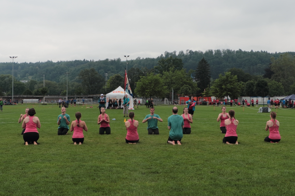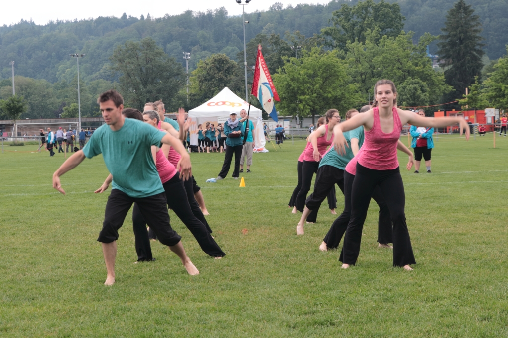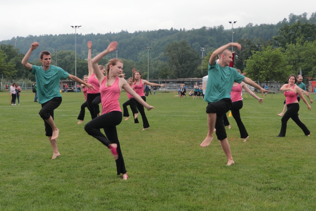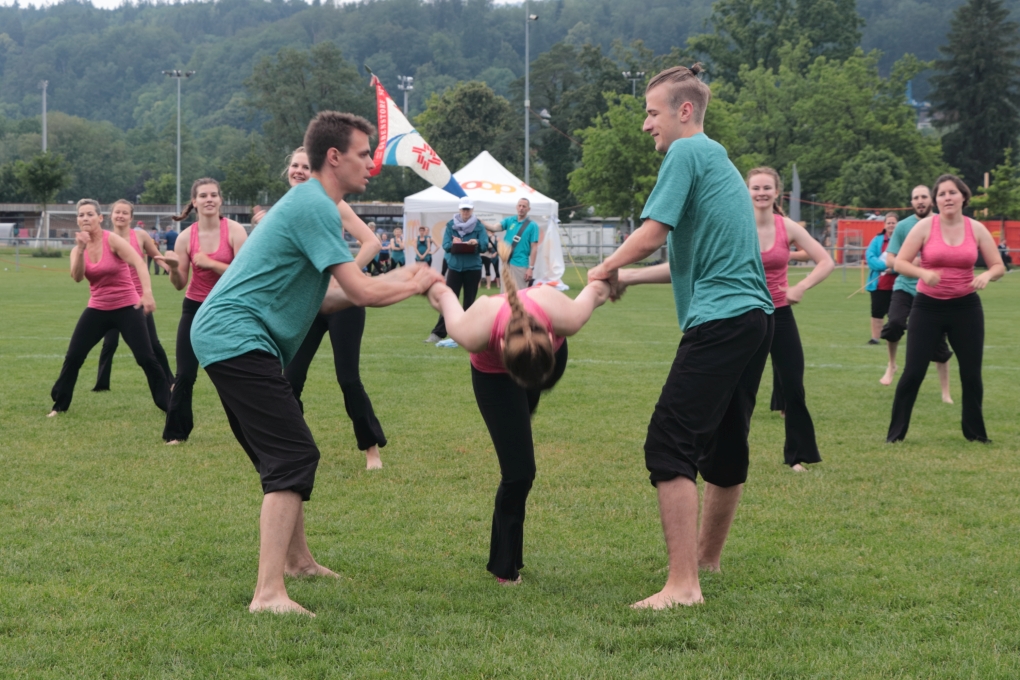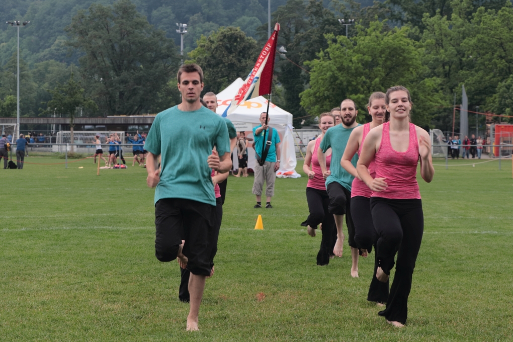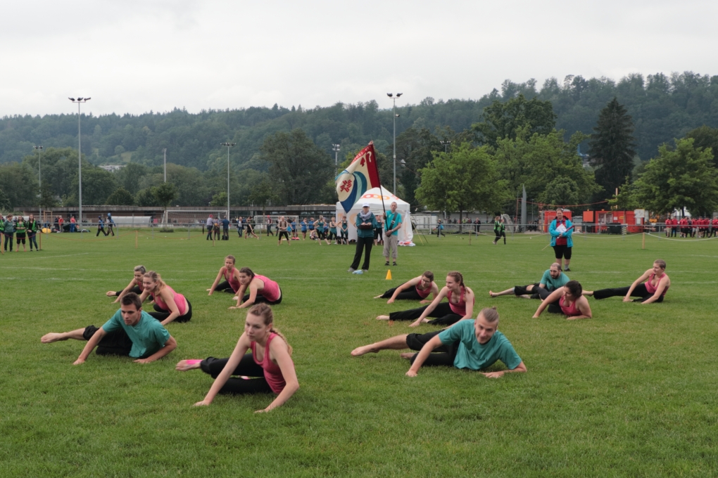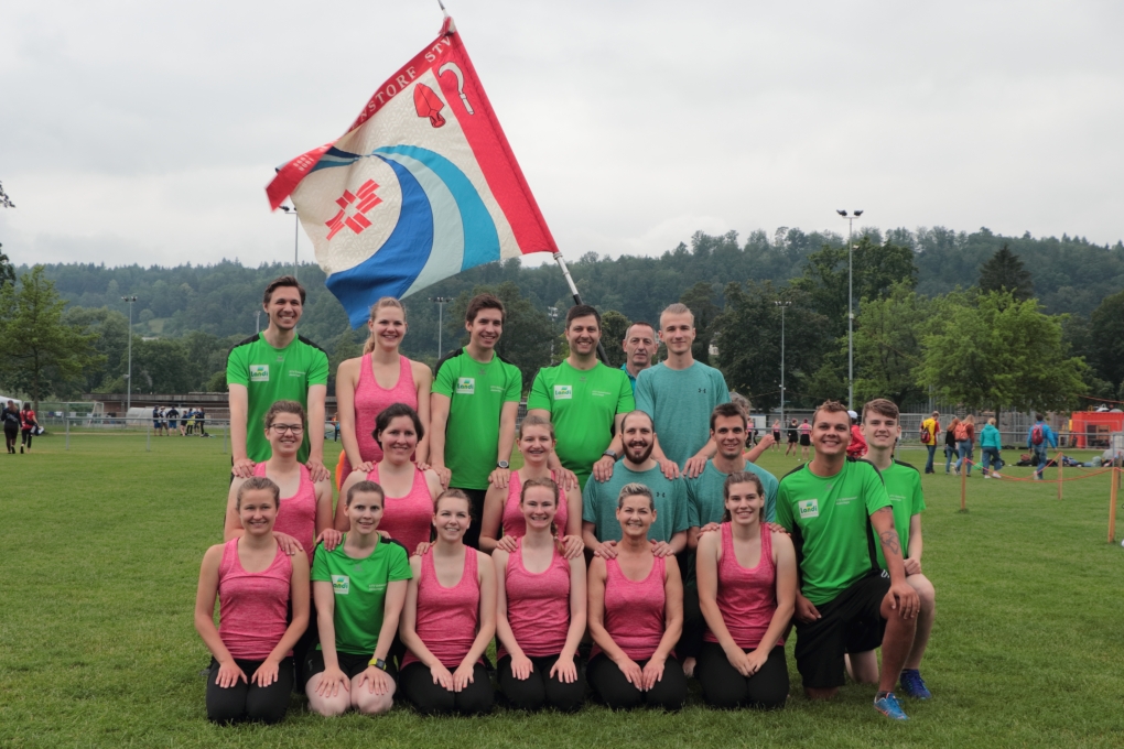 Gymnastik: Von den 10 Turner:innen welche aufliefen, waren 7 das erste Mal an einem Turnfest dabei und machten dementsprechend auch zum ersten Mal Gymnastik. Gerade noch vor dem Regen konnten wir unsere Nummer aufführen und wurden mit der Note 7.20 belohnt.