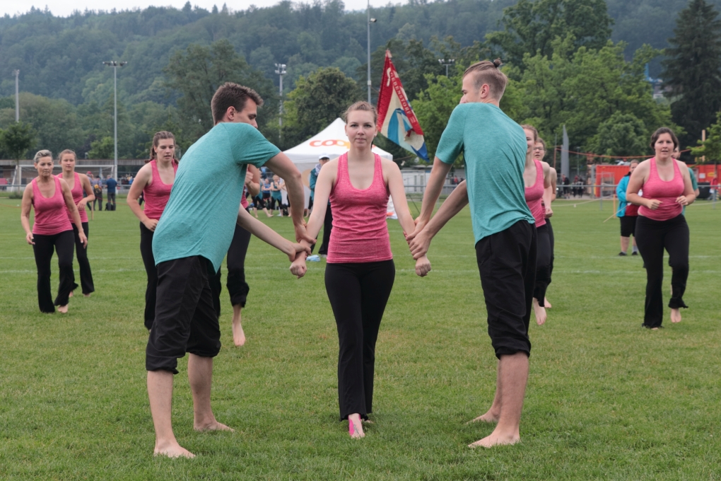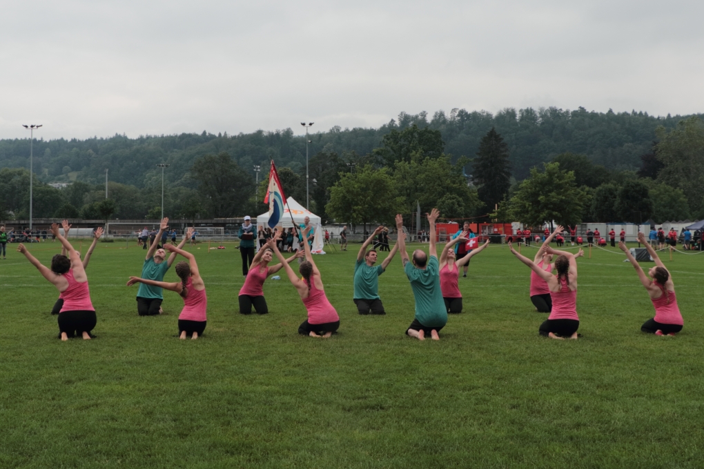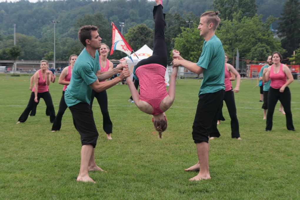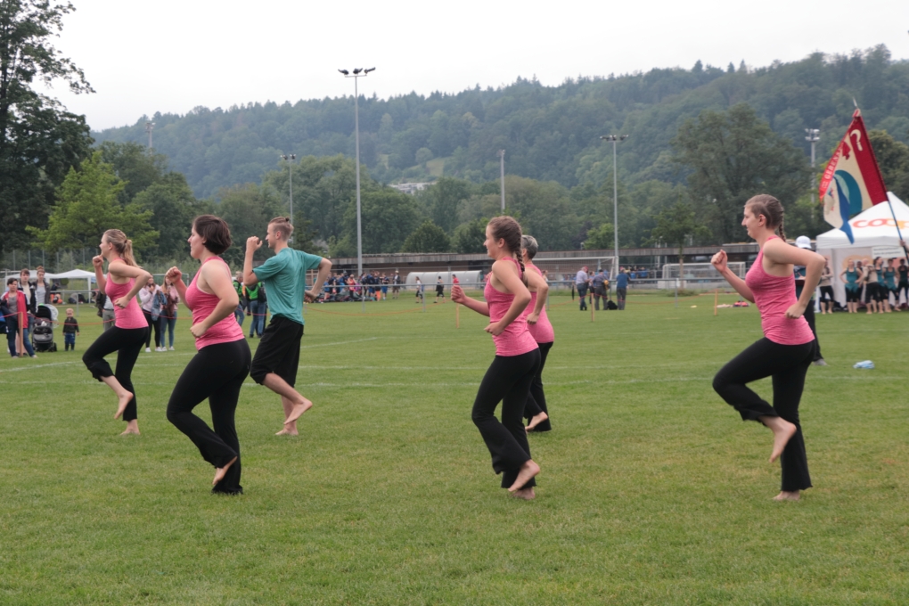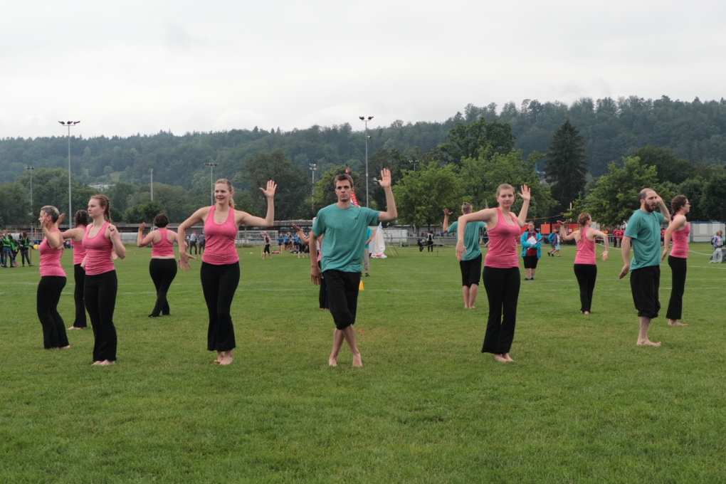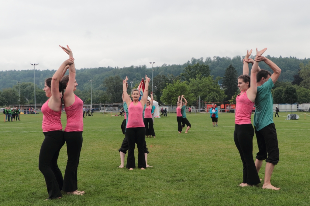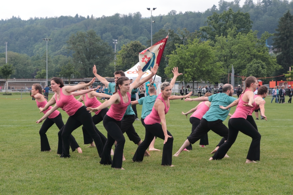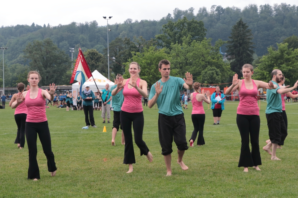 Gymnastik: Von den 10 Turner:innen welche aufliefen, waren 7 das erste Mal an einem Turnfest dabei und machten dementsprechend auch zum ersten Mal Gymnastik. Gerade noch vor dem Regen konnten wir unsere Nummer aufführen und wurden mit der Note 7.20 belohnt.