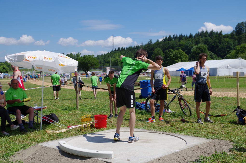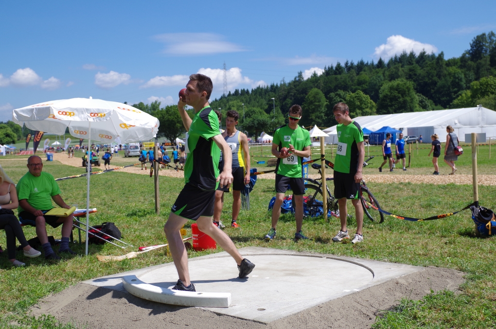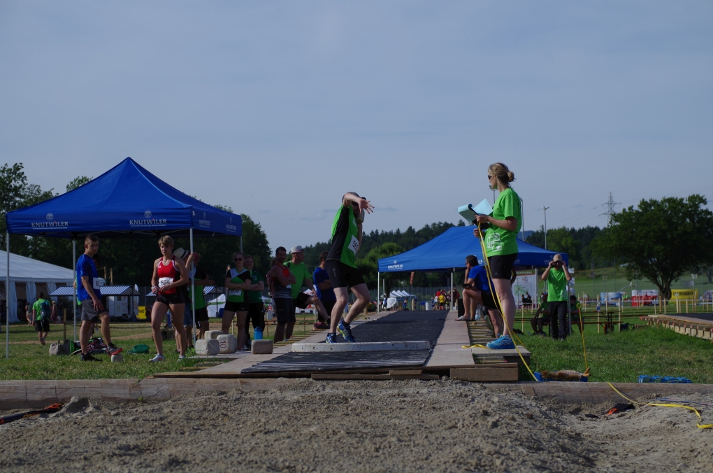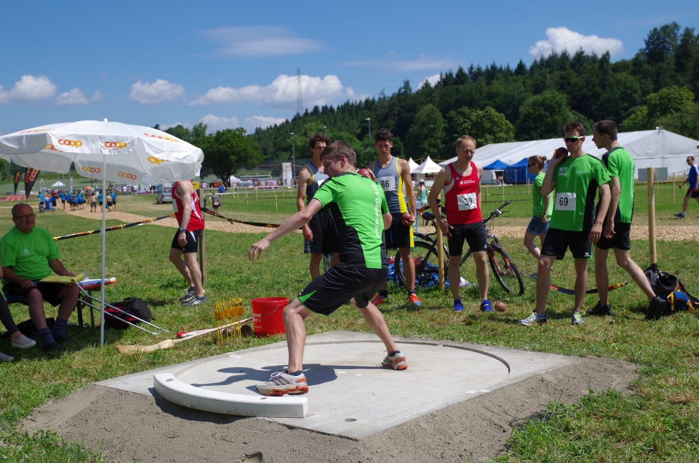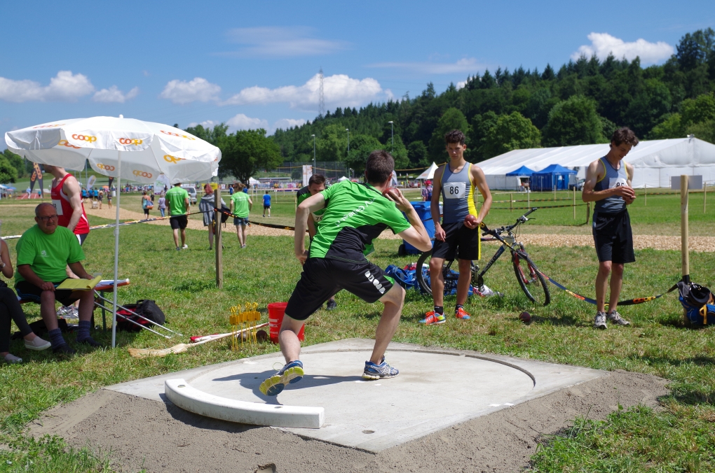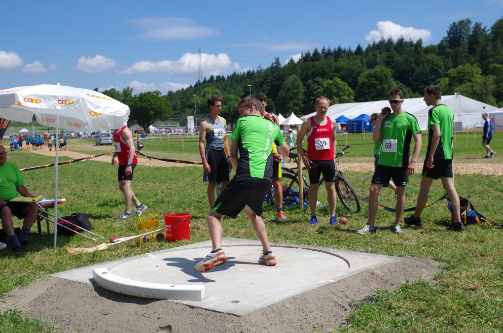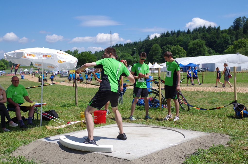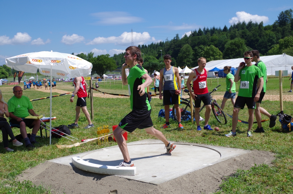 Weitsprung und Schleuderball: Hier zeigte die Organisation des ETF ein grosses Manko. Man musste sich nämlich mit den normalen ÖV zu den Wettkampfplätzen, welche in diesem Fall weit auseinander lagen, begeben. Dementsprechend kamen das Einlaufen und Vorbereiten zu kurz. Immerhin schien dies Svenja nicht zu beeindrucken, mit 4.31m erreichte sie die Note 9.00. Im Schleuderball war es dann so, dass die Anlaufbahn zu schmal war und unsere Aktivriegler:innen wortwörtlich aus der Bahn geworfen wurden.