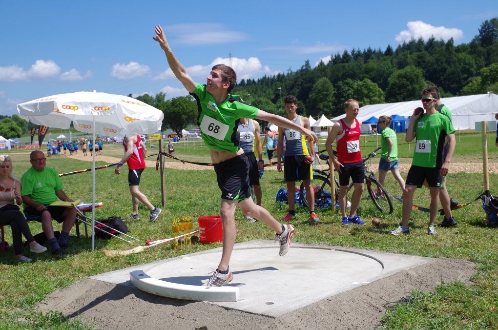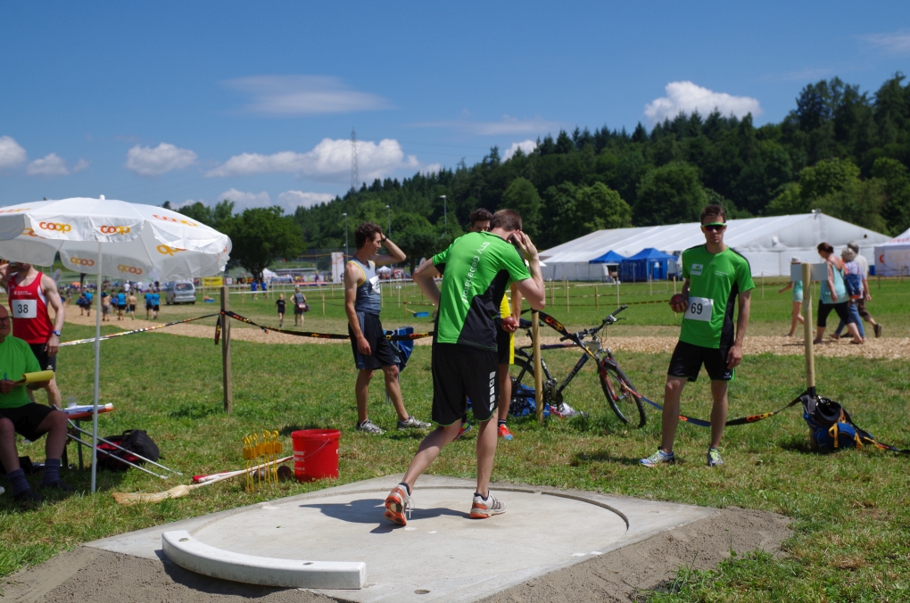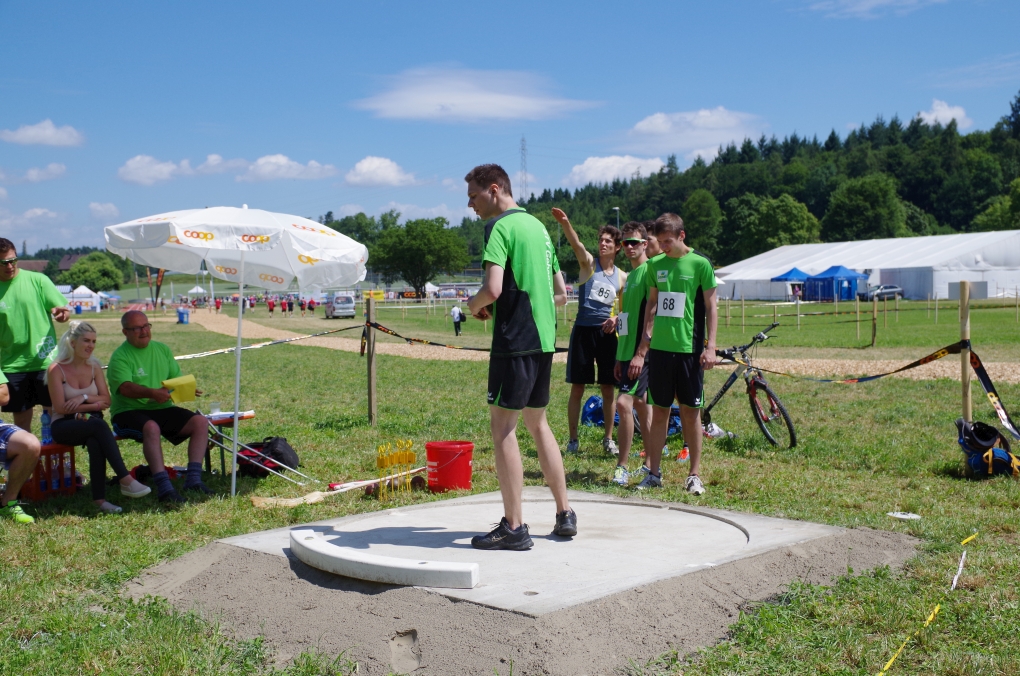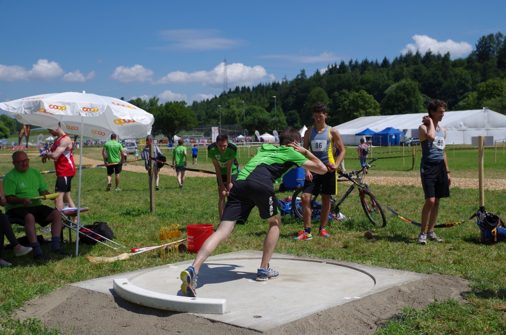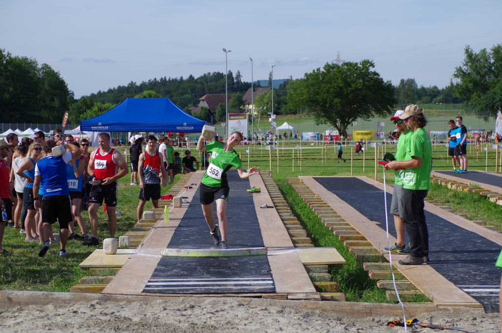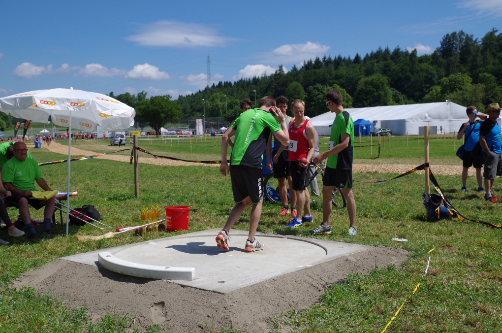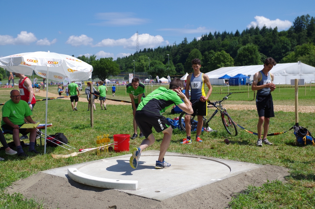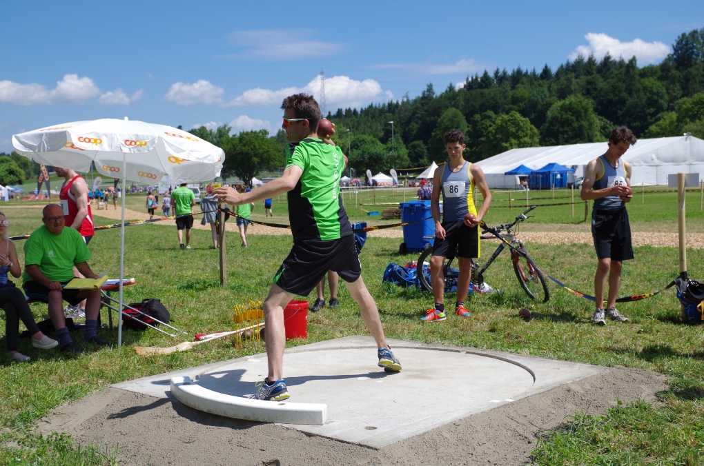 Weitsprung und Schleuderball: Hier zeigte die Organisation des ETF ein grosses Manko. Man musste sich nämlich mit den normalen ÖV zu den Wettkampfplätzen, welche in diesem Fall weit auseinander lagen, begeben. Dementsprechend kamen das Einlaufen und Vorbereiten zu kurz. Immerhin schien dies Svenja nicht zu beeindrucken, mit 4.31m erreichte sie die Note 9.00. Im Schleuderball war es dann so, dass die Anlaufbahn zu schmal war und unsere Aktivriegler:innen wortwörtlich aus der Bahn geworfen wurden.